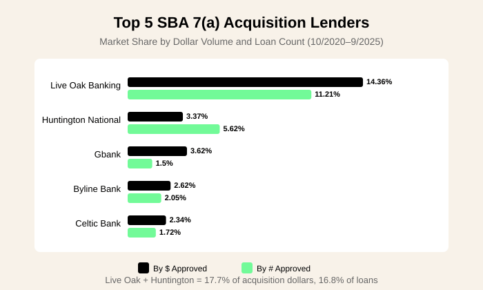 Market concentration is real. Live Oak Banking holds 14.36% of the acquisition market by dollar volume and 11.21% by loan count. Huntington National adds another 3.37% by dollars and 5.62% by count.